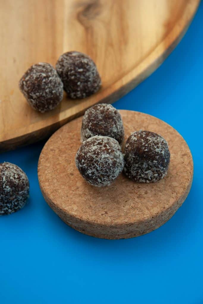 Option 1: Make energy balls. Mix 1 cup dates, 1 cup nuts, 1 scoop protein powder (20g), 2 tbsp cocoa powder, 1 tbsp chia seeds in a food processor. Roll into 10 balls. Each ball has about 5 g of protein. Keep in the fridge.