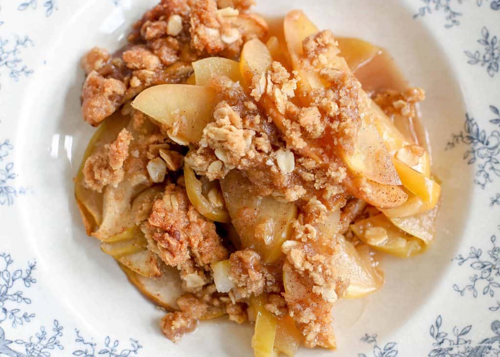 How to make it: Toss sliced apples with cinnamon, a squeeze of lemon, and a tablespoon of pure maple syrup. Pour into a baking dish. Mix rolled oats, almond flour, coconut oil, maple syrup, cinnamon, and a pinch of sea salt for the topping. Sprinkle over apples and bake at 350°F for 35–40 minutes until golden and bubbly.