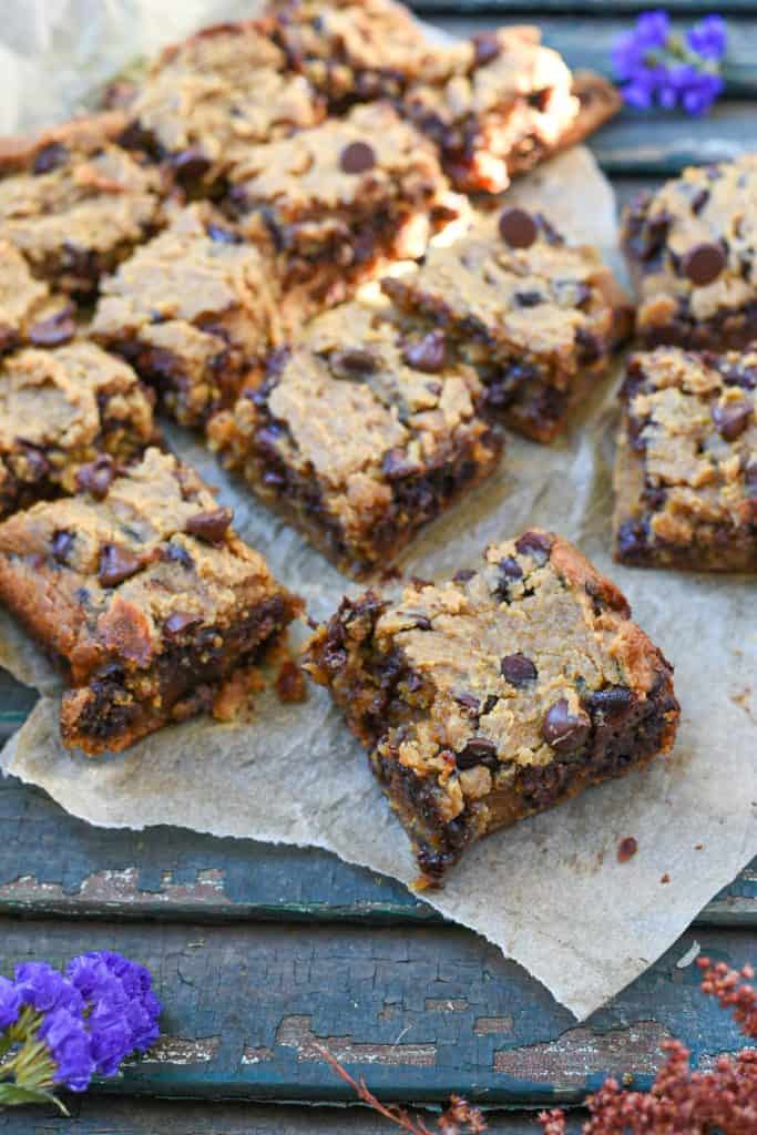 How to make them: Drain and rinse one 15 oz can of chickpeas. Blend with 1/3 cup almond butter, 1/3 cup pure maple syrup, 2 teaspoons vanilla extract, 1/2 teaspoon baking powder, 1/2 tsp baking soda, and a pinch of sea salt until completely smooth. Fold in 1/2 cup dark chocolate chips. Pour into a greased 8×8 pan and bake at 350°F for 22–28 minutes. Cool completely before cutting.